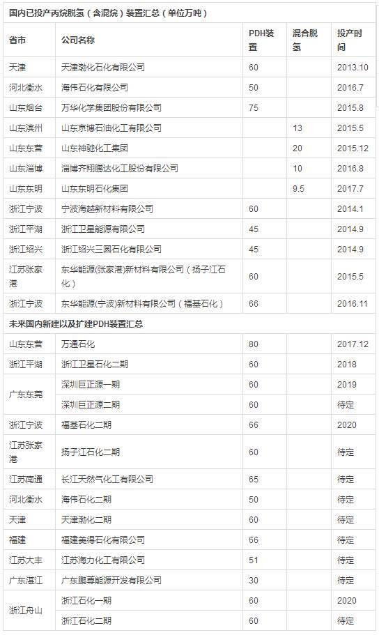 近年來,丙烷脫氫工藝在中國迅速發(fā)展,產能擴張速度驚人,逐漸成為丙烯重要來源之一。自2013年10月,隨著天津渤化60萬噸/年的丙烷脫氫裝置投產運行,丙烷脫氫裝置在國內正式拉開序幕。此后的幾年里,丙烷脫氫裝置在國內遍地開花,迅速發(fā)展,主要集中在華東的江浙地區(qū)、華北地區(qū)以及山東地區(qū),而且近兩三年混合烷烴脫氫這種更加靈活的裝置在山東地區(qū)陸續(xù)投產運行。至今,國內丙烷脫氫(含混烷)制丙烯總產能達到513.5萬噸。但是從下表可以看出,華南地區(qū)尚無丙烷脫氫裝置,深圳巨正源丙烷脫氫裝置建成后,將填補華南地區(qū)丙烷脫氫制高性能聚丙烯及下游加工項目的空缺,給當地化工企業(yè)提供優(yōu)質的化工原料。
