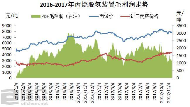 由上圖可見,2016-2017年丙烷脫氫毛利潤表現(xiàn)樂觀,裝置均無虧損情況,尤其在夏季,受原料氣丙烷價格低位,使丙烷脫氫裝置獲利更為理想。華南地區(qū)是國內進口氣集中地,而丙烷脫氫裝置,工藝來源于國外,原料氣丙烷也基本依賴進口,裝置在華南投產建設,原料提供方便。目前,華南地區(qū)的進口丙烷資源多作為工業(yè)氣或者搭配丁烷或者搭配當地煉廠氣今日民用市場,均是作為提供熱值的燃料,據隆眾數據監(jiān)控,2016年華南進口毛利潤在257元/噸左右,2017年至今進口毛利潤在194元/噸左右,相比丙烷脫氫裝置利潤優(yōu)勢十分明顯。
