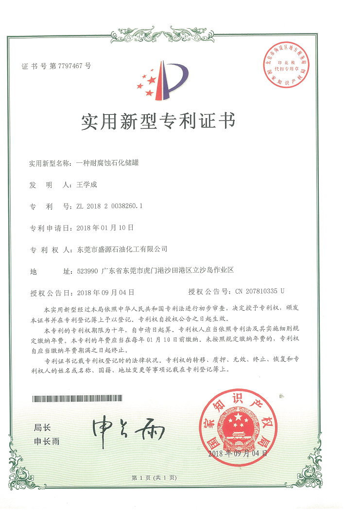 實用新型耐腐蝕儲罐專利證書Click for larger image
