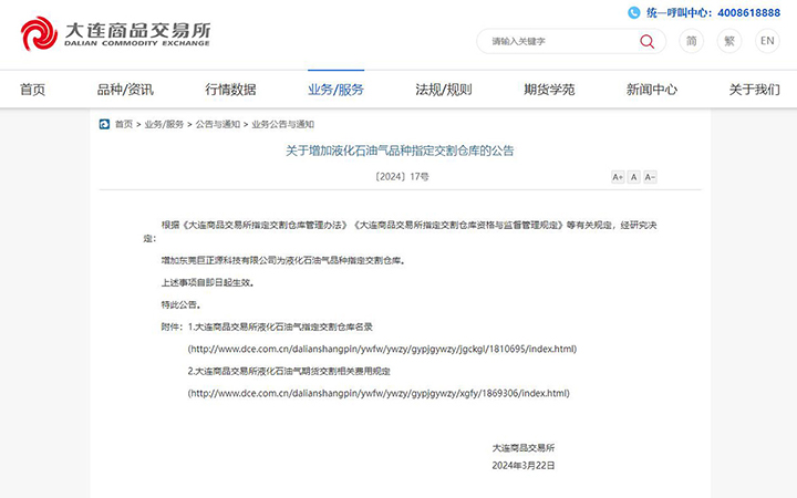 3月22月,大連商品交易所官網發布公告,增加東莞巨正源科技有限公司為液化石油氣品種指定交割倉庫,標準倉單最大量為90000噸,是該品種華南地區最大的基準庫,日發貨速度可達6000噸/天。