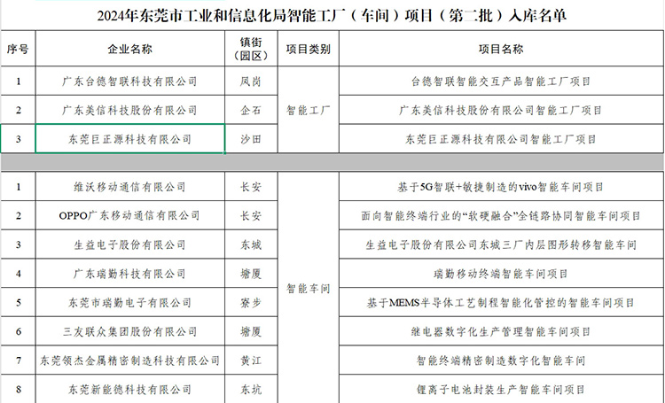 7月1日,東莞市工業和信息化局公布了2024年東莞市工業和信息化局智能工廠(車間)項目(第二批)入庫名單。東莞巨正源科技有限公司憑借在數字化轉型和智能制造領域的創新實踐與顯著成效,獲評為“東莞市智能工廠”。